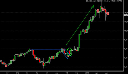 Das Beispiel zeigt einen Wochenchart der Celgene Aktie, welche an der Nasdaq gelistet ist. Man erkennt, dass Celgene im März 2012 ein Zwischenhoch bei 80 Dollar geformt hat. Aber in den folgenden Monaten korrigierte das Papier wieder in einem u-förmigen Bogen und erreichte im September 2012 wieder das Niveau von 80 $. Dies war jedoch nicht das Ende der Konsolidierung. Das Ohr war noch nicht gebildet! Und das tat Celgene dann, bilderbuchmäßig! Fünf Wochen lang formte die Aktie einen Pullback und fiel zurück bis auf 72 $. Auf dem Chart bildete sich ein kleiner Abwärtskanal (blaue Linien). Der Ausbruch aus diesem Kanal war dann das definive Kaufsignal. Ab diesem Zeitpunkt konnte man mit diesem Papier mehr als 70 $ je Aktie verdienen. Eine lohnende Investition!