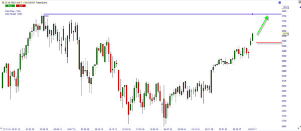 Analyse: Nachdem der Eurostoxx50-Future (FESX) fast das ganze Jahr 2016 unterhalb der Marke 3050 konsolidierte, steigt er seit Dezember 2016 stark an und macht sich nun auf, das Hoch von April 2015 bei 3769 anzusteuern.