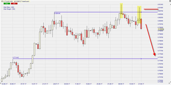 Am 20. September erfolgte ein erneuter Versuch, den Widerstand bei 0,8065 (blaue Linie oben) zu überwinden. Dieser misslang, und das Paar bildete erneut eine bearishe Umkehrkerze (in Gelb). Wir versuchen das bearishe Sentiment mit einer Limit-Order zu nutzen und gehen Short. Unser Kursziel ist die Unterstützungszone bei 0,7714 (blaue Linie unten).